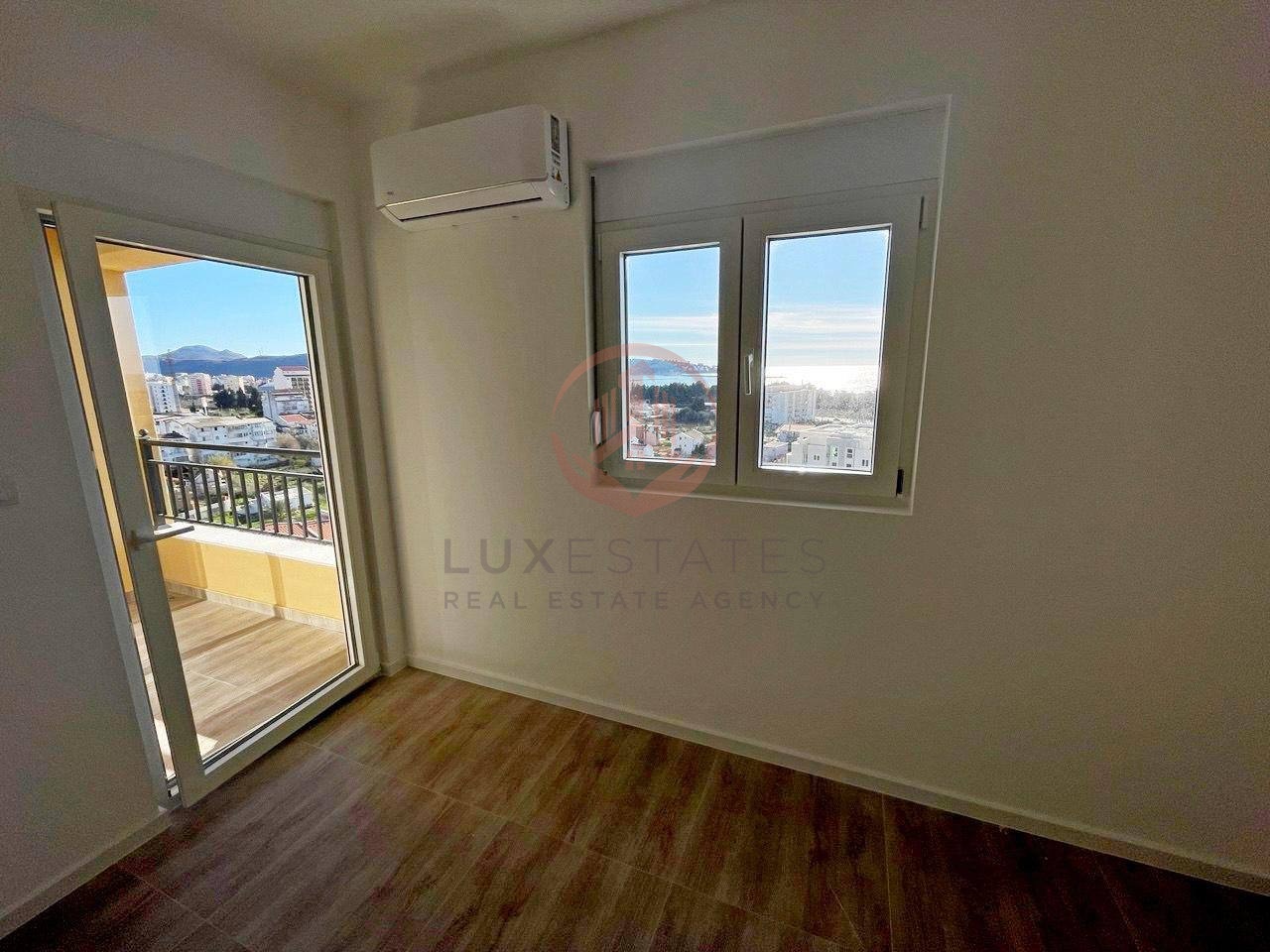 Bar, Sužanj, new apartment with panoramic sea view. Modern building constructed with high-quality materials. Two elevators. The sea is within walking distance, only 500 m. Nearby Anto Djedović school. Area 47 m², 7th floor. Price €125,000.